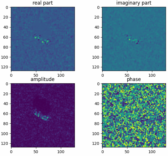 import torchbox as tb import matplotlib.pyplot as plt filepath = datapath + 'BTR70_HB03787.004' x = tb.mstar_raw(filepath, ofmt='c') print(x.shape, th.max(x.abs()), th.min(x.abs())) plt.figure() plt.subplot(221) plt.imshow(x.real) plt.title('real part') plt.subplot(222) plt.imshow(x.imag) plt.title('imaginary part') plt.subplot(223) plt.imshow(x.abs()) plt.title('amplitude') plt.subplot(224) plt.imshow(x.angle()) plt.title('phase') plt.show()